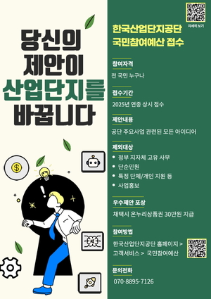 [기계신문] 한국산업단지공단은 산업단지의 지속가능한 발전과 현장 중심의 예산 운영을 위해 국민 누구나 직접 참여할 수 있는 ‘국민참여예산’ 제안을 연중 상시 접수한다고 밝혔다.‘국민참여예산’은 국민이 직접 공공기관 예산사업을 제안할 수 있는 제도이다. 한국산업단지공단은 2019년 제도 도입 이후 입주업체 소화기 지원, 산업단지 안전디자인 설계·지원 등 총 9건의 제안을 채택해 약 5억 원의 반영하며 현장에서 체감할 수 있는 변화를 만들어왔다.제안 가능 분야는 ▶산업단지 디지털·탄소중립 전환 ▶노후산업단지 정주여건 개선 ▶안전관리 강