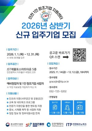 [기계신문] 인천테크노파크(이하 인천TP)는 제물포에 위치한 ‘인천 1인 창조기업 지원센터’의 신규 입주기업을 오는 12월 12일까지 모집한다고 밝혔다.‘인천 1인 창조기업 지원센터’는 중소벤처기업부와 인천광역시가 지원하는 창업 공간으로, JST제물포스마트타운(인천 미추홀구 석정로 229) 5층에 자리 잡고 있다.센터는 1인 창조기업의 창업과 성장을 돕기 위해 사무공간을 제공하고 ▲경영· 세무·마케팅 등 분야별 전문가 1:1 멘토링 ▲창업 역량강화 교육 ▲네트워크 구축 기회 등 다양한 창업 지원 프로그램을 운영하고 있다.모집 규모는