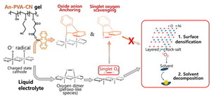 [기계신문] UNIST는 에너지화학공학과 송현곤 교수팀이 한국화학연구원 정서현 박사, 한국전자기술연구원 황치현 박사팀과 함께 배터리를 고전압으로 충전할 때 전극에서 활성산소가 새어 나오는 반응을 원천 봉쇄하는 ‘안트라센 기반 반고체 젤 전해질(An-PVA-CN)’을 개발했다고 밝혔다.고전압 배터리는 4.4V 이상의 전압으로 충전되는 리튬이온전지로, 더 많은 전기를 저장할 수 있어 배터리팩을 가볍게 만들 수 있다. 하지만 충전 전압이 높아질수록 하이니켈 양극의 산소가 불안정해지면서 ‘일중항산소’라는 활성산소로 변해 빠져나오게 되는데,