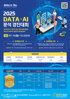 [기계신문] 한국과학기술정보연구원(KISTI)이 주관하고 국가과학기술연구회, 국회도서관, 대전광역시, 해양경찰청, 대전중구청이 공동 주최하는 ‘2025 DATA·AI 분석 경진대회’가 7월 14일(월)부터 10월 30일(목)까지 개최된다.올해로 6회째를 맞은 이번 경진대회는 데이터와 인공지능(AI)을 기반으로 다양한 사회·과학 문제를 해결하기 위해 매년 개최되고 있다.총상금은 1,400만 원으로, 대상 수상자에게는 국회의장상과 함께 400만 원의 상금이 수여된다. 또한 우수 수상자에게는 학술대회 발표와 후속 공동연구 참여 기회가 제