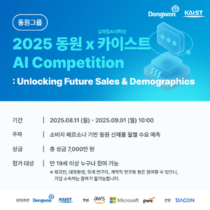 [기계신문] 동원그룹과 KAIST가 공동 주최하는 대국민 AI 경진대회 ‘2025 동원 AI Competition’가 8월 11일부터 9월 30일까지 약 50일간 개최된다.‘2025 동원 AI Competition’은 대한민국의 AI 우수 인재 발굴과 기술 발전을 위해 마련된 행사로, 그동안 동원그룹 임직원을 대상으로 진행해온 사내 AI 대회를 전 국민으로 확대한 것이다.참가 접수는 9월 1일까지 AI 경진대회 플랫폼 데이콘(DACON)에서 진행되며, 평가 및 검증 기간을 거쳐 9월 22일 본선 진출작이 선정된다. 본선 및 시상식은