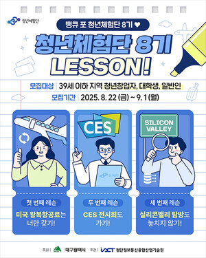 [기계신문] 대구시가 지역 청년들의 글로벌 역량 강화와 창의적 문제해결능력 함양을 위해 ‘4차산업혁명 청년체험단 8기’ 참가자를 오는 9월 1일까지 모집한다.‘4차산업혁명 청년체험단’은 CES 2026, 실리콘밸리 등 세계적 기술 현장을 직접 체험하며, 이를 지역사회에 적용할 혁신 아이디어 발굴을 목표로 한다.39세 이하 대구 청년 창업자와 대학생을 중심으로, 총 15명 내외의 소수 정예 인원을 선발할 예정이며, 선발은 블라인드 방식을 통해 투명하고 공정하게 진행된다.참가자에게는 왕복 항공료, 숙식, 비자 발급 및 보험 가입 등 미