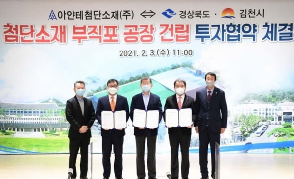 이에 아얀테첨단소재㈜는 경상북도, 김천시와 3일 김천시청에서 아얀테첨단소재㈜ 문국현 대표,㈜이오스파트너즈 윤여진 대표, 하대성 경북도 경제부지사, 김충섭 김천시장이 참석한 가운데 투자양해각서(MOU)를 체결했다.