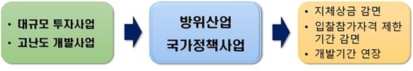 우선 방위산업에 기업의 적극적 참여를 유도하기 위해 고난도 기술개발 또는 대규모 투자가 필요한 사업을 국가정책사업으로 지정하여 지체상금 감면, 입찰참가자격제한기간 감면, 개발기간 연장 등의 혜택이 부여된다.