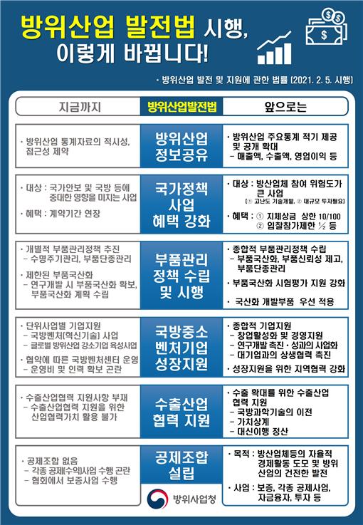 2월 5일부터 시행되는 「방위산업발전법」 및 관련 하위법령의 주요 내용으로는 방위산업 국가정책사업 지정, 수출촉진, 선제적 부품개발 확대, 공제조합 신설, 방산기업 지원 확대 등이 있다.