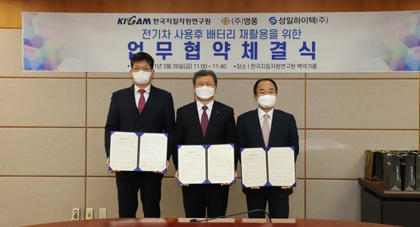 [기계신문] 한국지질자원연구원과 ㈜영풍, 성일하이텍㈜이 26일(금) 지질자원연구원 백악기룸에서 ‘전기차 배터리 재활용 연구개발 및 상용화 기반조성’에 관한 업무협약을 체결했다.
