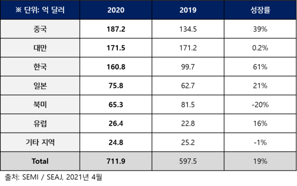 [기계신문] 글로벌 전자산업 공급망을 대표하는 산업 협회인 SEMI의 최신 세계 반도체 장비시장 통계(Worldwide Semiconductor Equipment Market Statistics, WWSEMS)에 따르면, 2020년 전 세계 반도체 장비 매출액은 712억 달러로 2019년 598억 달러 대비 19% 증가하면서 역대 최대 규모를 기록했다.