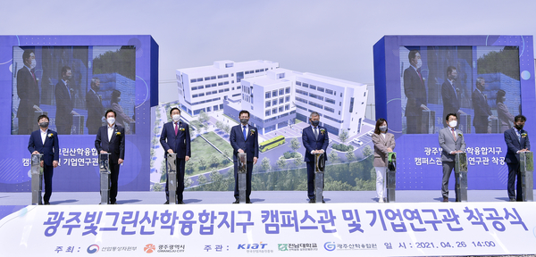 [기계신문] 광주광역시가 26일(월) 광주빛그린산단에서 산업단지 내 기업과 대학을 공간적으로 통합해 산업현장에서 연구개발과 인력양성, 고용이 선순환되는 새로운 산학협력 모델을 구현하기 위한 빛그린산학융합지구 캠퍼스관과 기업연구관 착공식을 개최했다.