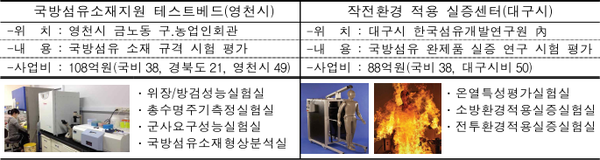 섬유소재기업 지원을 위한 기반구축 과제 중 영천시에 설치되는 국방섬유소재지원테스트베드는 국방섬유소재의 특수기능, 군사요구 성능평가 등 소재개발과 생산기업에 대한 성능평가를 지원하고, 대구시에 설치되는 작전환경적용실증센터는 완제품에 대한 전투환경적용 평가를 지원하게 된다.