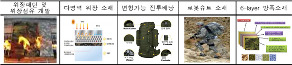 ‘국방섬유소재산업 육성사업’은 5년 동안 기반구축 2개 과제 ▶국방섬유소재지원테스트베드 구축 ▶작전환경적용실증센터 구축, R&D 5개 과제 ▶4세대 다파장영역 위장패턴 및 위장섬유 개발 ▶사계절용 고기능성 위장 외피 개발 ▶착용형 로봇슈트에 적용되는 섬유소재 개발 ▶트랜스포머 기능 모듈형 전투배낭 개발 ▶방폭용 다층다축구조 섬유집합체 제조기술 및 소재 개발 등으로 추진된다.