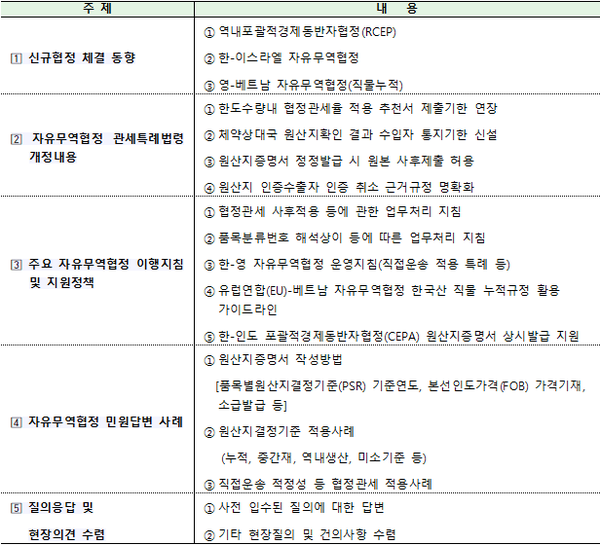설명회에서는 역내포괄적경제동반자협정(RCEP), 한-이스라엘 자유무역협정 등 신규 협정 발효 동향, 6월 시행 예정인 자유무역협정 관세법령 개정내용 및 주요 자유무역협정 이행지침을 소개하고, 주요 민원사례 안내와 질의응답도 병행해 진행할 계획이다.