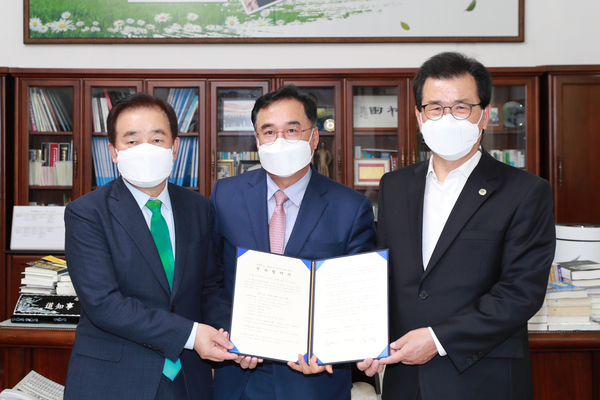 ㈜다인소재는 18일 충북도, 진천군과 최태호 다인소재 대표이사, 이시종 충북도지사, 송기섭 진천군수 등 관계자 10여명이 참석한 가운데 투자협약을 체결했다.
