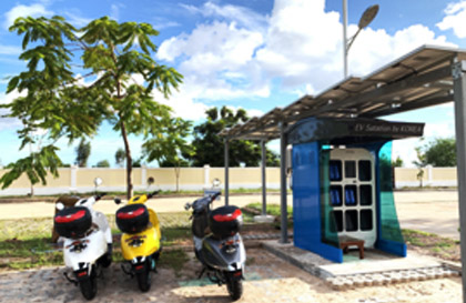 e-모빌리티 사업은 오토바이와 3륜 차량의 사용이 많은 동남아를 전략시장으로 해 태양광 등 신재생에너지 기반의 배터리 충전시스템을 활용한 비즈니스 모델을 실현하는 사업이다.