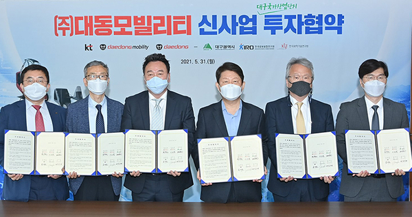 이에 31일 대구시청에서 ㈜대동 원유현 총괄사장, ㈜대동모빌리티 이승원 대표이사를 비롯해 권영진 대구시장, 송재호 KT 부사장, 여준구 한국로봇융합연구원(KIRO) 원장, 김익재 한국과학기술연구원(KIST) AI·로봇연구소장이 참석한 가운데 대동그룹의 e-모빌리티 신사업 투자협약(MOU)이 체결됐다.
