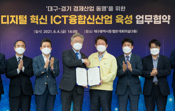 [기계신문] 경기도와 대구광역시가 디지털 산업의 균형 발전과 D·N·A(데이터·네트워크·인공지능) 기술 기반 마련을 위해 4일 대구시청에서 ‘디지털 혁신 ICT(정보통신기술)융합신산업 육성을 위한 업무협약’을 체결했다.