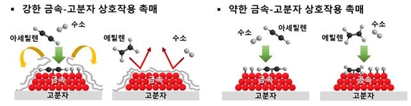 연구팀이 개발한 신규 촉매를 이 공정에 적용한 결과, 강하게 상호작용해 3차원 구조를 형성한 촉매는 고분자가 아세틸렌에만 접근해 높은 선택도를 보였다. 하지만 약한 상호작용으로 인해 고분자가 금속 표면을 덮지 못한 촉매에서는 아세틸렌과 에틸렌에 모두 접근해 낮은 선택도를 보였다.