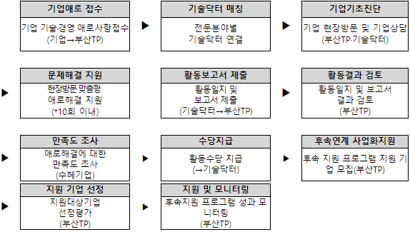 신청 기업에 대해서는 신청서 접수→서면검토→전문가 매칭→기초컨설팅→심화컨설팅의 단계를 거쳐 선정일로부터 3개월 이내 기업 애로사항 해결을 위한 지원이 이루어지며, 추후 후속 맞춤형 프로그램은 산업지원 기술닥터 활용 기업을 대상으로 별도 공고를 통해 선정하여 지원하게 된다.