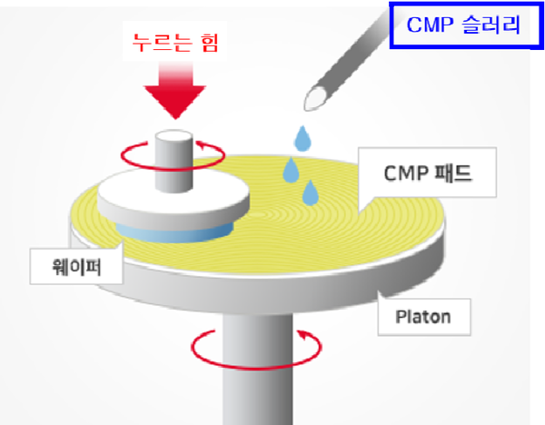 CMP 공정은 화학적(Chemical) 연마와 기계적(Mechanical) 연마가 함께 이루어지는 하이브리드 공정으로서, 반도체 웨이퍼를 CMP 패드에 압착하고 이 사이로 CMP 슬러리를 흘려주면서 장비가 CMP 패드를 고속으로 회전시키면 연마(평탄화)가 이루어진다.