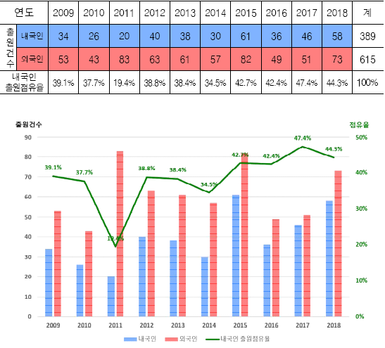 특허청에 따르면, CMP 슬러리 관련 특허출원은 2009년 87건에서 2018년 131건으로 연평균 4.7% 증가했다. 이 중 내국인의 출원 증가율은 6.1%로 외국인의 출원 증가율(3.6%)을 상회했고, 내국인의 출원 점유율은 2009년 39.1%에서 2018년에는 44.3%로 5.2% 만큼 증가했다.