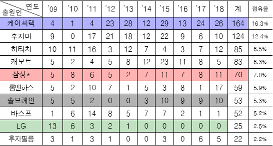 이는 국내 시장 점유율이 높은 글로벌 선도 기업들이 특허분쟁 등의 사유로 특허출원에 주춤한 사이, 국내기업들이 CMP 슬러리 국산화 비중 확대를 위해 꾸준히 노력한 결과로 보인다.