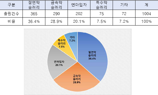 세부 기술별로 살펴보면, 실리콘 절연막 슬러리 관련 출원(36.4%, 365건)이 가장 많았다. 이어서 구리, 텅스텐 등 금속막 슬러리 관련 출원(28.9%, 290건), 연마입자 관련 출원(20.1%, 202건), 유기막, 상변화막 등 특수막 슬러리 관련 출원(7.5%, 75건) 순으로 나타났다.
