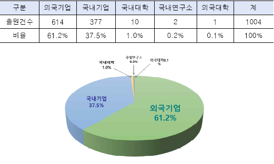 출원인 유형별로 살펴보면, 외국기업이 61.2%(614건), 국내기업이 37.5%(377건)로 국내외 기업들이 특허출원을 주도하였고, 기타 국내대학은 1.0%(10건), 국내연구소는 0.2%(2건), 외국대학은 0.1%(1건)로 저조했다.