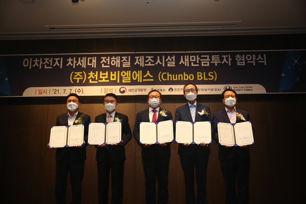 이에 ㈜천보비엘에스는 7일(수) 새만금개발청, 전라북도, 군산시와 천보비엘에스 이상율 대표이사, 양충모 새만금개발청장, 송하진 전라북도지사, 강임준 군산시장 등 20여 명이 참석한 가운데 투자협약을 체결했다.