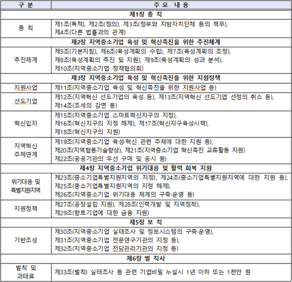 「지역중소기업법」 제정안은 총 6장 33조로 구성되며 주요 내용으로, 우선 지역중소기업의 정의와 정부 및 지자체의 지역중소기업 육성 책무를 명시적으로 규정했다. 수도권을 포함한 각 시·도 관할구역에 소재하는 중소기업을 ‘지역중소기업’으로 폭넓게 정의하되 비수도권 중소기업에 대해서는 우대지원 근거를 마련했다.