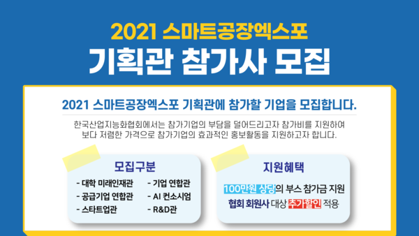[기계신문] 한국산업지능화협회(舊한국스마트제조산업협회)가 오는 9월 8일~10일 서울 코엑스에서 개최하는 ‘2021 스마트공장엑스포’ 기획관에 참여할 기업을 모집한다.