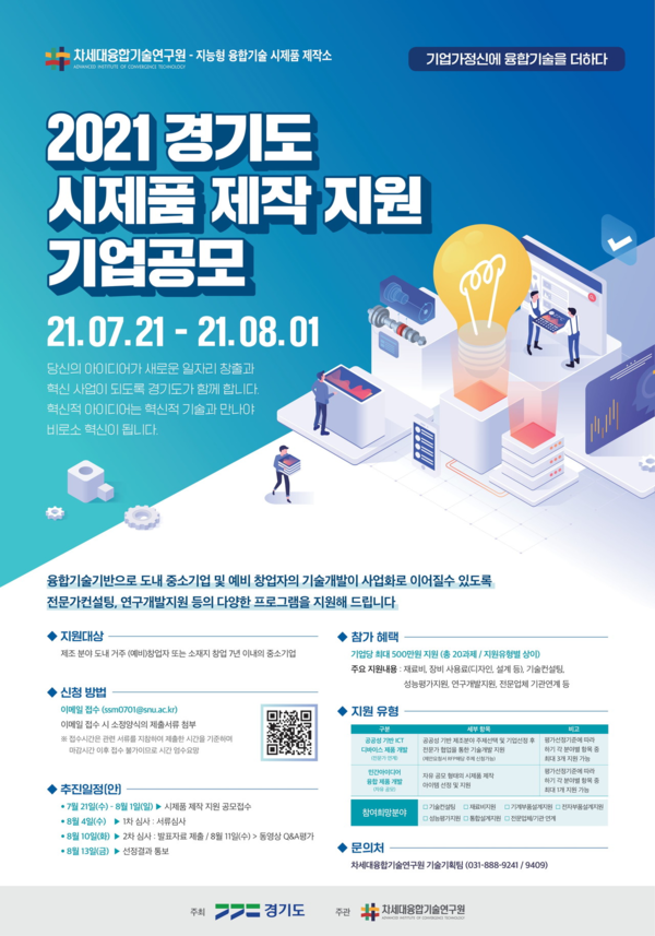 [기계신문] 경기도와 차세대융합기술연구원이 오는 8월 1일(일)까지 ‘2021 경기도 시제품 제작지원 기업 공모’를 실시한다.