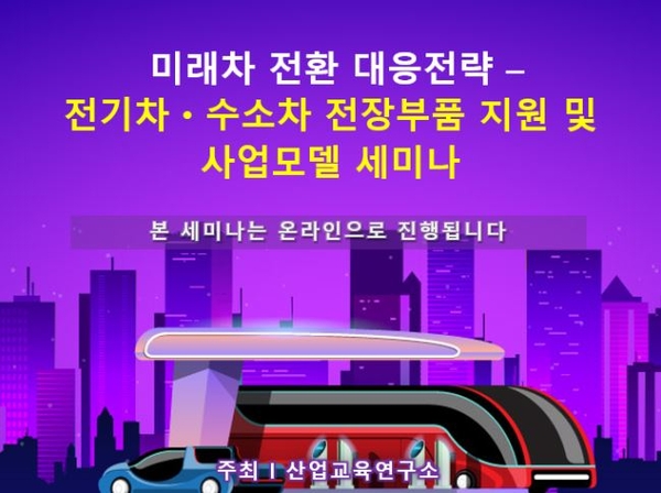 이러한 가운데 산업교육연구소가 오는 8월 20일(금) ‘미래차 전환 대응전략 - 전기차·수소차 전장부품 지원 및 사업모델 세미나’를 온라인 개최한다.