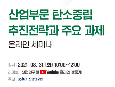 산업연구원은 8월 31일(화) 대한상공회의소 의원회의실에서 ‘산업부문 탄소중립 추진전략과 주요 과제’를 주제로 한 세미나를 산업연구원 유튜브 채널을 통해 온라인 개최한다.