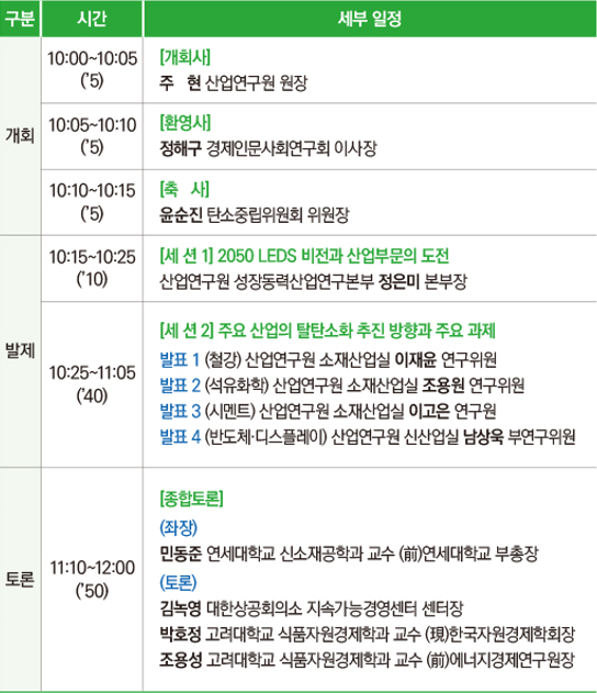 발표 세션은 ▶2050 LEDS비전과 산업부문의 도전 ▶주요 산업의 탈탄소화 추진 방향과 주요 과제 등 두 가지 주제로 구성되며, 산업연구원을 포함한 산업계, 학계 및 연구기관의 전문가들이 토론에 참석한다.