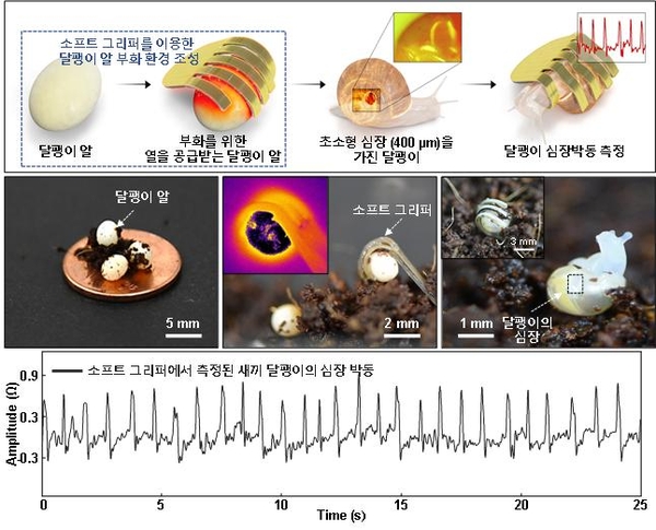 실제로 연구팀은 이 로봇을 통해 직경 3 mm도 안되는 작고 부드러운 달팽이 알을 터트리지 않고 잡아 열을 가해 부화시키는데 성공했으며, 부화 과정에서 발생하는 미세한 기계적 움직임을 측정함은 물론, 부화 직후 달팽이의 미세 심장박동 수까지 정확히 측정해냈다.