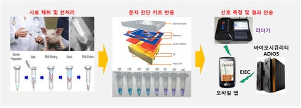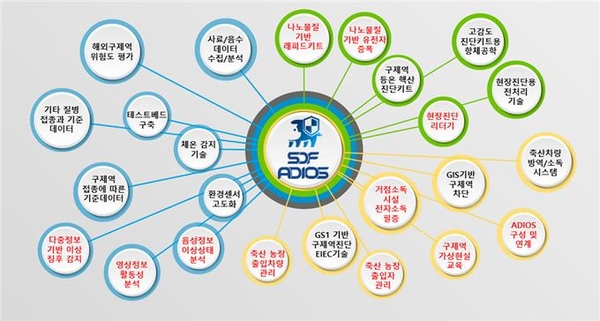 이상징후가 발생한 농가에는 방역관이 파견되어 현장에서 진단 키트로 실제 감염 여부를 판단한다. 이때 SDF융합연구단은 기존 상용화된 기술보다 감도가 10배 높고 검사 시간은 절반 이하로 단축시킨 진단키트를 개발했다. 진단 정보는 바로 ‘아디오스’로 송출되어 사용자의 주관 개입 없이 정보의 오류가 최소화되도록 만들었다.