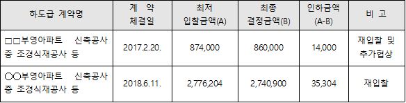 이 과정에서 최저 입찰가가 자체 실행예산을 초과하지 않는 등 정당한 사유가 없음에도 재입찰 또는 추가협상을 통해 최저가 입찰금액보다 낮은 금액(차액총액 158,426천 원)으로 하도급대금을 결정한 사실이 있다.