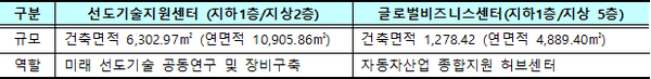 이번에 기업지원을 위한 ‘선도기술지원센터’와 ‘글로벌비즈니스센터’ 2개 동의 건축이 마무리되었다. 선도기술지원센터는 국내 부품기업의 친환경차 기술 및 부품개발 지원을 위해 180여종의 시험·인증 등 장비가 구축되는 종합 기술지원동이다.