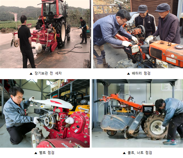 농기계를 장기 보관하기 전에 깨끗이 닦고 각 회전 부위나 절단 부위, 벨트, 체인 등을 철저히 점검, 미리 정비해 둬야 농기계 성능을 유지하면서 오래 사용할 수 있다.