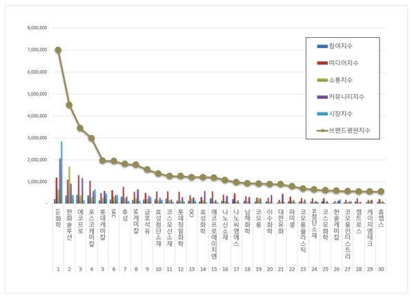 브랜드평판 1위를 기록한 LG화학 브랜드는 ▶참여지수 220,332 ▶미디어지수 1,188,925 ▶소통지수 677,523 ▶커뮤니티지수 2,065,067 ▶시장지수 2,846,795가 되면서 브랜드평판지수 6,998,641로 분석됐다. 지난 11월 브랜드평판지수 6,810,426과 비교하면 2.76% 상승했다.