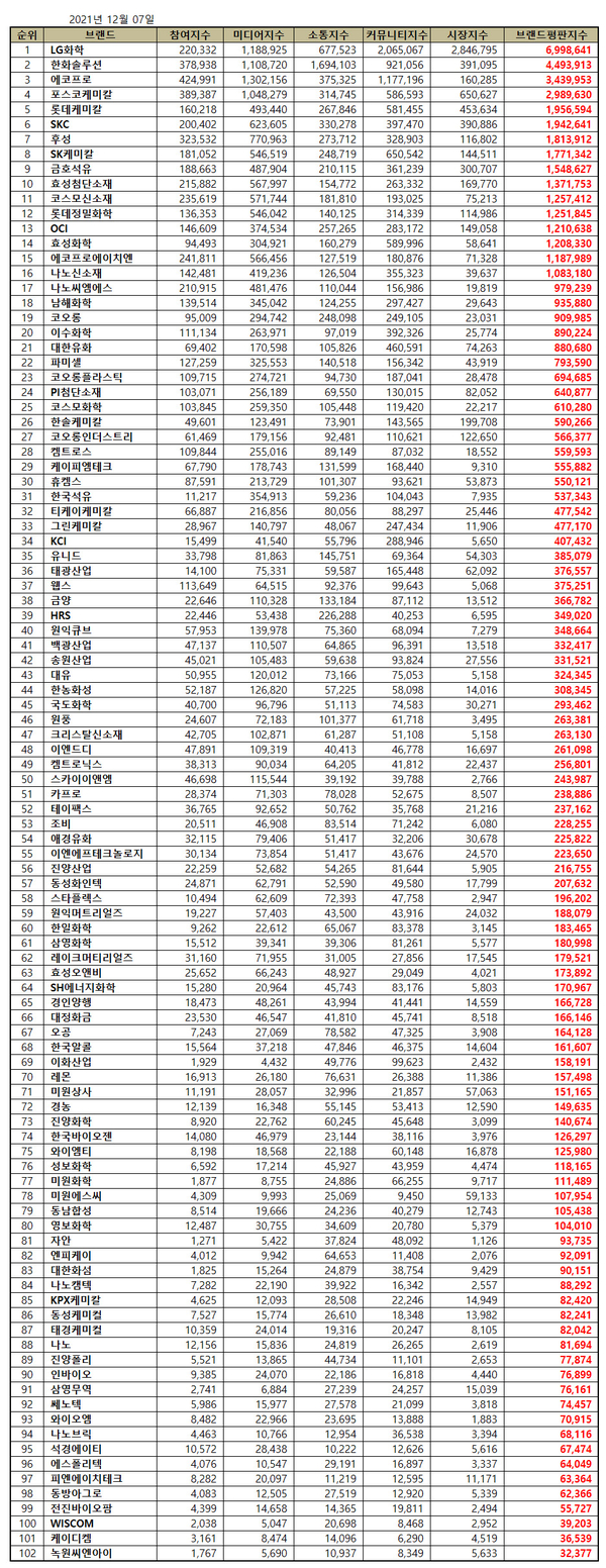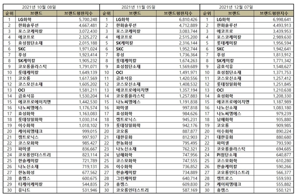 12월 화학 상장기업 브랜드평판 30위 순위는 LG화학, 한화솔루션, 에코프로, 포스코케미칼, 롯데케미칼, SKC, 후성, SK케미칼, 금호석유, 효성첨단소재, 코스모신소재, 롯데정밀화학, OCI, 효성화학, 에코프로에이치엔, 나노신소재, 나노씨엠에스, 남해화학, 코오롱, 이수화학, 대한유화, 파미셀, 코오롱플라스틱, PI첨단소재, 코스모화학, 한솔케미칼, 코오롱인더스트리, 켐트로스, 케이피엠테크, 휴켐스 순으로 분석됐다.