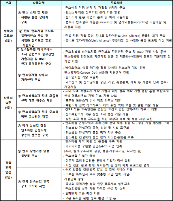 전북도는 올해 초부터 탄소산업발전위원회 산하에 실무 전문가로 구성된 생태계고도화분과, 상용화촉진분과, 창업‧인력양성분과 등 3개 분과위원회를 운영하면서 전북 탄소산업을 발전시킬 정책과제를 발굴했다. 발굴된 정책과제는 7월 탄소산업발전위원회 자문에 이어 이번 12월에 심의를 거쳐 최종 확정된 것이다.