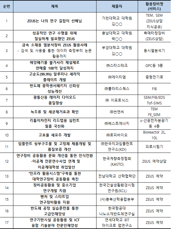 이번에 발굴된 장비활용 우수사례는 ▶㈜스타스테크가 연구장비활용종합포털 장비예약 서비스를 통해 해양폐기물인 불가사리를 활용하여 친환경 제설제를 개발한 사례 ▶㈜베스트에너지가 연구장비활용종합포털을 통해 한국기초과학지원연구원의 x-선광전자분광기 등 장비를 활용하여 리튬이차전지에 사용되는 필름을 국산화한 사례 ▶㈜에이테임이 강원테크노파크의 중형전기로 장비를 활용하여 고순도 알루미나 세라믹 소재를 개발한 사례 등 연구자와 기업들이 연구장비를 활용하여 성과목표를 달성한 우수사례 17건이 발굴·선정되었다.