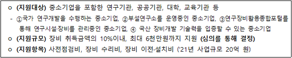 ‘나눔장비 이전지원 사업’은 정부출연 연구기관 등 공공연구기관에 있는 활용성이 떨어진 연구장비를 필요한 기관으로 이전할 경우 그 이전비용(수리비, 이전설치비)을 지원하는 사업으로 2010년부터 시행하고 있다. 특히 2019년부터는 연구기반이 열악한 중소기업도 연구장비를 이전받을 수 있도록 사업을 개선하여 최근 중소기업으로 연구장비 이전이 점차 늘어나고 있는 추세이다.