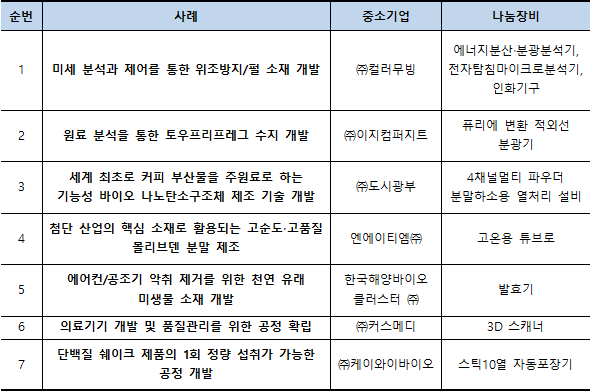 ‘나눔장비 활용 중소기업 우수사례’는 나눔장비 이전지원 사업을 통해 연구장비를 이전받은 중소기업 들이 해당분야 연구개발에 적극적인 활용으로 성과를 창출한 사례로 ▶㈜컬러무빙 ▶㈜이지컴퍼지트 ▶㈜도시광부 ▶엔에이티엠㈜ ▶한국해양바이오클러스터㈜ ▶㈜커스메디 ▶㈜케이와이바이오 7개 중소기업의 사례가 발굴·선정되었다.
