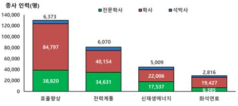 2021년 에너지산업 기술인력 실태조사에 따르면, 2020년 기준 에너지산업에 종사하는 기술인력은 291,452명, 이 중 2020년에 신규 배출·공급된 인력은 23,626명이다. 분야별 인력규모는 효율향상(129,991명), 전력계통(80,855명), 신재생에너지(44,553명) 순이며, 석·박사급 기술인력(20,859명)은 7% 수준이다.