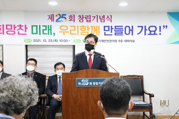 김태곤 대한건설기계안전관리원장은 “제25회 창립기념식에 함께하는 우리 모두는 변화와 혁신을 선택해야 하는 중요한 변곡점에 서 있다”면서 “안전가치를 선도하는 글로벌한 조직으로 성장하기 위해 우리 모두의 역량을 집중하고 뼈를 깎는 내부혁신을 통해 건설기계 안전에 대한 최고의 안전종합전문기관으로 성장해 나가자”고 강조했다.