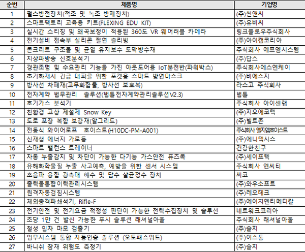 이번에 선정된 혁신제품에는 다중이용시설 등의 화재사고로 인한 인명피해를 크게 줄일 수 있는 ’포켓용 스마트 방연마스크‘와 이산화탄소 저감 효과가 있고 전기 공급이 어려운 지역에 활용될 수 있는 풍력과 태양광을 활용하는 ’하이브리드 방식의 가로등‘ 등이 포함됐다.
