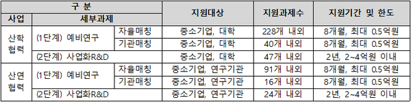 1단계 예비연구과제 375개(산학협력 268개, 산연협력 107개)와 2단계 사업화 연구개발(R&D) 과제 71개(산학협력 47개, 산연협력 24개) 등 총 446개 과제를 신규 선정할 예정이다.