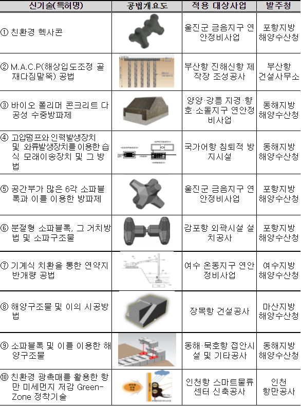 올해는 총 14건의 신기술이 접수되었으며 관련 분야 외부 전문가로 구성된 심의위원회의 심의를 거쳐 친환경 헥사콘, 해상입도 조정 골재다짐말뚝(M.A.C.P) 공법 등 총 10건의 신기술을 2022년도 시험시공 지원 대상으로 최종 선정했다. 이 신기술은 내년에 시행되는 부산, 인천, 동해, 여수, 울진지역의 항만과 어항건설 그리고 연안정비사업에 시험 적용될 예정이다.