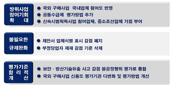 이번 제도 개선은 ➊업체의 방위사업 참여기회 확대, ➋불필요한 규제 완화, ➌제안서 평가기준의 합리적인 개선에 중점을 두고 추진하였다.